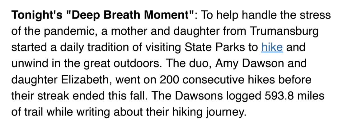 On October 21, 2020, the Ithaca Times covered our hike streak (see Ithaca Times: Equally Motivated). On November 6, 2020, New York State Governor Andrew M. Cuomo linked to this post as part of his daily newsletter’s “Deep Breath Moment.” That was pretty amazing!