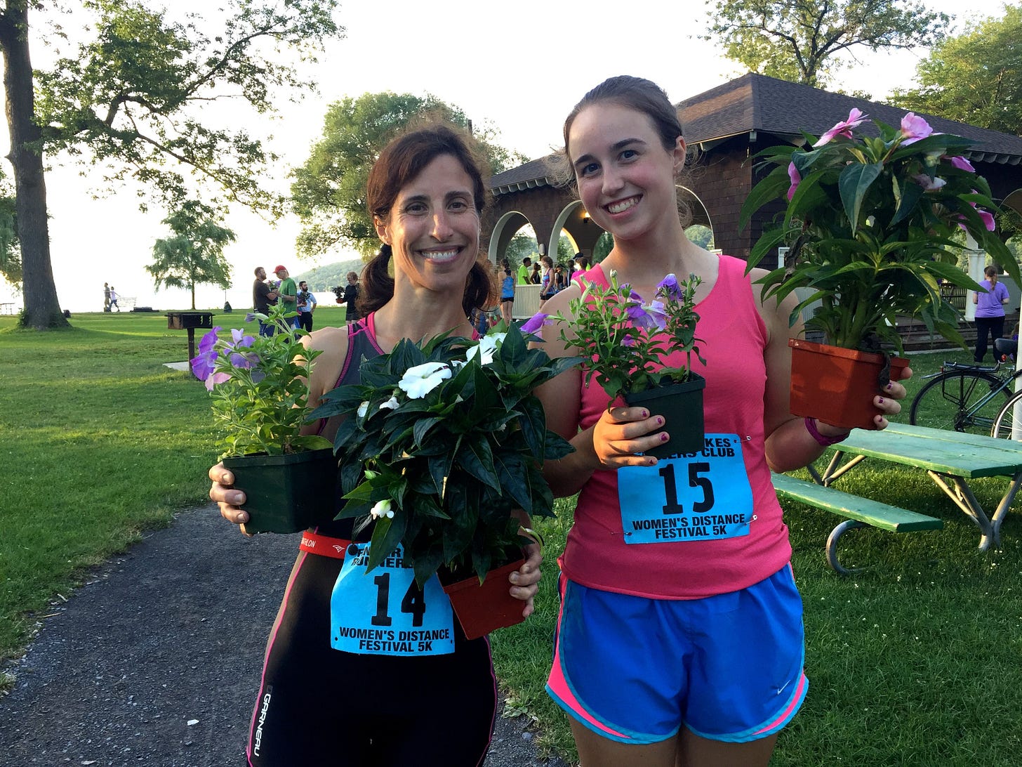 It is hard to believe Elizabeth and I considered skipping this even this year. We’ve been running it since she was a little girl!! They moved it to Stewart Park in Ithaca (from Dryden) which makes it a flat and fast out and back instead of a hilly looped course. Suddenly the race felt like it would be PRESSURE for speed instead of a hilly challenge. We waffled but signed up, only to have it POUR all day long. Never ones to be deterred by weather (well almost never) we headed down for the race just as the skies brightened. This race was fun! I definitely recommend it as an evening summer event. Ladies only, men volunteer and cheer and they always have fun prizes.
