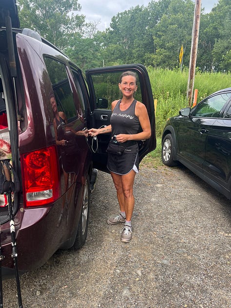 We arrived at Beebe hot and tired. It was 94 degrees by this point and almost 2 pm. I took my shirt off for this, planning to change into a new one, but it felt so breathtakingly wonderful to not have a shirt on that I chose to stay in my sports bra. We negotiated that we’d run some and I invited Scott to join us. He hadn’t been that far ahead of us in Treman and his legs were very fatigued. He was concerned about “crashing our party” but I assured him that it was ok. I didn’t actually check in with Teressa about this, and felt a bit bad about that, but we were a crew bound by the travel, so it felt ok. Walked, shuffled, ran, walked, shuffled, ran and somehow made it through the 4 miles still smiling.