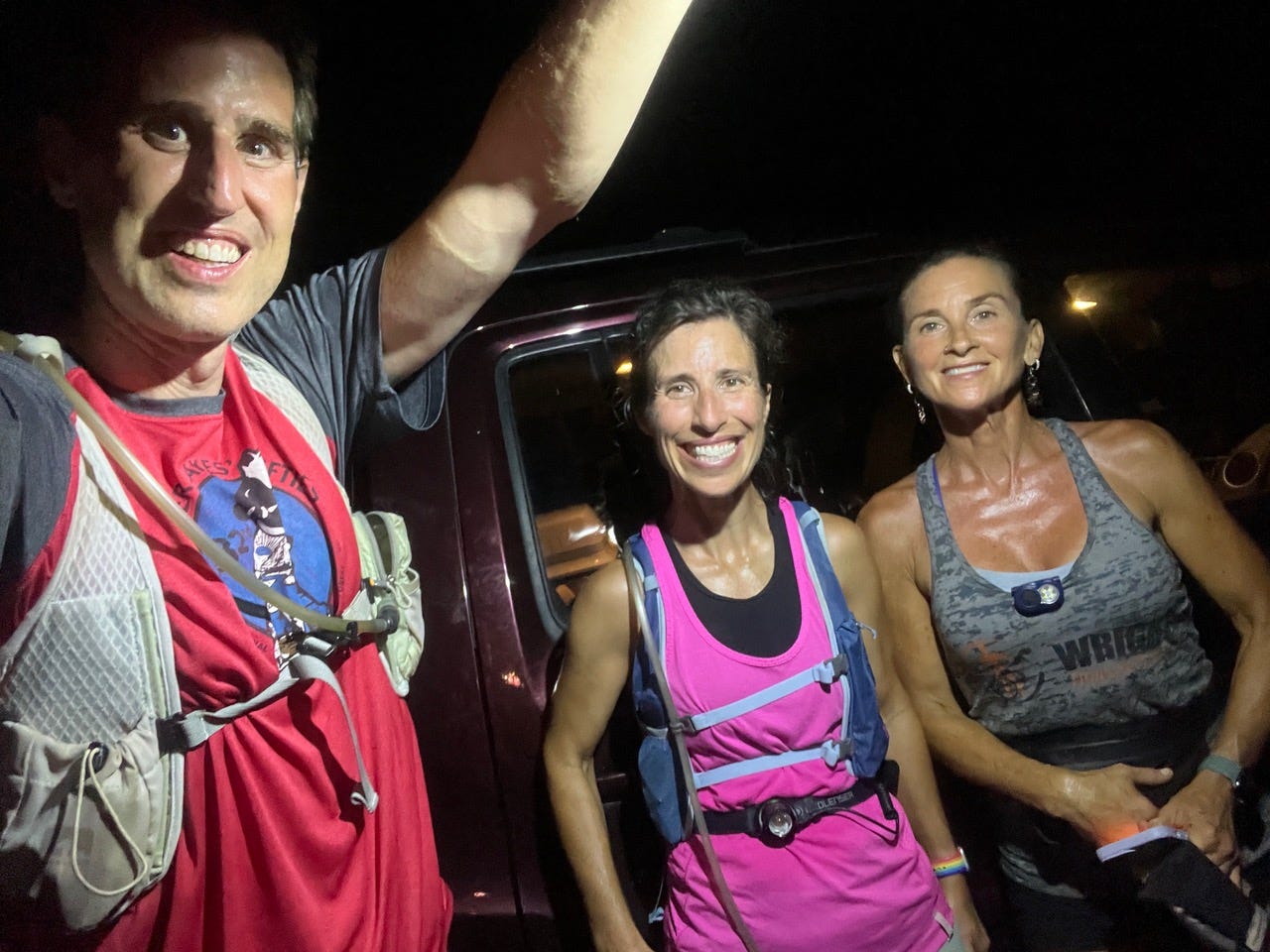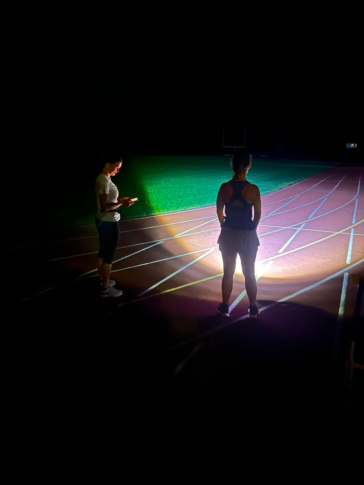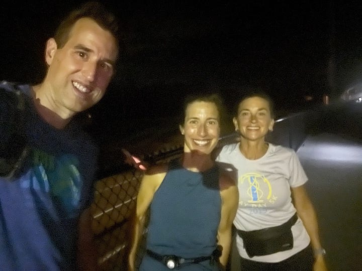 We kicked off with the mile right before 3 am. On a moonless night, the air so thick it felt like you were running through water, we drove right up to the track, nabbed a picture and ran a mile. I was wearing a waist lamp my sister gave me to light the track for Teressa and me. Scott ran at his own pace. My highlight of this mile was the intense gratitude that I felt for my sister for sending this. It was over a year ago and showed up very out of the blue. I tossed it somewhere and promptly forgot about it. So much so that I ordered clip lights for this run because I knew headlamp running gave me a headache. Scott was the beneficiary of those lights and Teressa and I enjoyed this very bright (and comfortable) waist light!