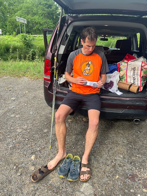 This side felt never ending and the single track was monotonous. I’m not the best hike leader and my voice doesn’t travel well, so our conversation faded. A lot of this hike was quiet. We were tired and my feet were slopping around in my hiking shoes. We tried to run the downhills, but there were not a lot of downhills. Still, we did run most of them, including one luxuriously long one that felt amazing! One thing we noticed on this leg was that we saw so many more things than when we ran the course. Another thing that really hit me was how SLOWLY the miles tick along when you are hiking. I do love to hike, but mostly when there is a view in it for me. Today there was no view - only a wet, single track, semi-overgrown trail slog. With just a few miles to go I winced as I planted my right foot. My right pinky toe clearly had developed its typical pointy toe callus. I wasn’t able to walk normally for long enough that I panicked that I’d need to have one of the kids pick me up. Soon, I forced myself to step normally, wincing with each footfall. I remembered Heather Cobb telling me that when she did this, she shared with her feet hurt. Her friend pointed out that her feet should hurt. What did she expect? I formed this into a little mantra for the day. Yup. My feet hurt. What did I expect?