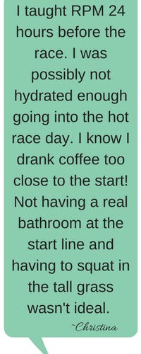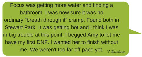 We only saw the bathroom because the woman who was with us jetted over there. I told Christina to head there and planned to meet her at the water stop (just 50 yards away). Friend friend Cory West was working the stop and I chatted with him about his upcoming 100 miler!! Soon, Christina was back and I greeted her with water. “Ready?” I asked. “Do you feel better?” I was still optimistic at this time that she could rebound from this.