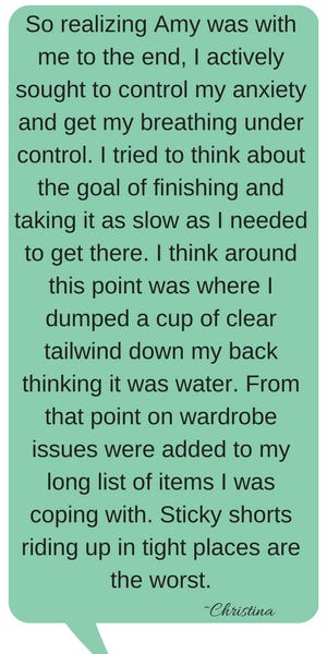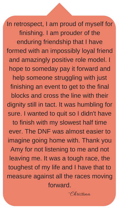 I am proud of Christina. I thought a lot about this after the race. I am someone who won’t even run near a pacing group. It freaks me out to know that I might not be able to keep up. My mind gets consumed with, “What if I fall off their pace?” The closest I’ve ever come to being vulnerable on a run is when I was training for a 50K with my friend Jenny. We had some tough runs, but with runs of that distance, it was usually a back and forth kind of thing. We both had highs and lows in the same training run. And, it was trail. There’s just something about trail that makes things feel emotionally safer. It is crazy weird, but it is an alternate universe to road running. It was HARD for Christina to struggle like that in front of a friend. It would have been so easy for her to quit, stomp her feet and say, “LEAVE” and actually mean it!! She kept going and she reached deep and gave that course everything she had that day.