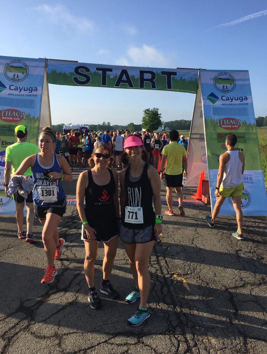 I didn’t specifically “train” for this race. This means that I didn’t actually alter my plans and focus purposefully for a half marathon. I raced the Flower City Half a month and a half ago so I hadn’t decided yet whether I wanted to race this or run with the kids or a friend. Two days before the race, Christina and I were running with our normal Thursday morning group. She asked my plan and I said, “I don’t know what I want to do.” Our friend Teresa, also running with us, planned to race it. I felt like I was ready to race, but also wasn’t sure I really cared to run all out. Christina and I ran Skunk Cabbage and had a blast together. I thought it was rather fun to motivate someone else and have a great run to just enjoy the event and all the moments. I’ve paced my daughter and son before and find that I’m a pretty good supporter for others. I said to Christina, “sure let’s run together.” In that moment, I realized that I wouldn’t need a music playlist, I wouldn’t stress about a PR, and I could just enjoy the day. In the back of my mind I thought, “I can pace Christina to a sub 2 hour race!” Our Skunk time was 2:01 and change and this course was easier. I knew Christina was ready! I’d been running long with her every weekend for the past several weeks. She’s in great shape and I was super confident that we’d stroll into the finish and celebrate our 1:58 or 1:59 and enjoy the after party.