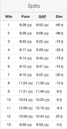 Soon Ian was talking and the familiar ram’s horn blared. We were off. We settled into a quick clip and after about a half mile I noticed Katie was right with us. We chatted briefly about her shorts of choice as we’d had a back and forth about shorts recently. She bought Oiselle shorts for the race and was liking them quite well so far. Then, as we turned downhill our friend Teresa caught us. We wished her well as she passed us by. I had my watch set on current pace and we’d been hovering in the low 8s every time I looked. The course was downhill at this point and would start to level out, so I didn’t worry much. As we turned onto the Black Diamond trail and the grade leveled a bit, I said to Christina, “I’m going to slow us down, ok?” She replied that this was ok and I tried to slow us a bit. Still, we didn’t slow very much. She said, “I can’t really talk but I’m ok with that if you are.” I see this as the turning point of the race. We were not yet at mile 3 and she was telling me she wasn’t at a conversational pace. I slowed down more, but not enough. If I had been running with Elizabeth, I would have forced us to a much slower pace, a pace where she could chat easily. I was overconfident that Christina was well trained and overzealous in my own desire to pull her to a sub-2. With these two things conspiring, we kept going pretty close to the pace we had been.