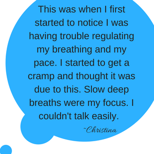 Suddenly I was jolted to reality when I heard our pace and time announced behind us. Yes, the music listeners had it set to give them pace updates. “Ok, this will be fine,” I thought. “Maybe they have it on mile increments.” What seemed like just moments later I heard it again. “OH my goodness! Are you kidding me?” I said to Christina. I realized we were actually running the same pace as these people. Our only choice was to speed up or slow down. At the moment speeding up didn’t look like an option. Christina said something to them about these broadcasts. They were happy as larks, as they shared that it was set to update every two minutes. Luckily our bathroom stop would serve to give some distance between us and them.