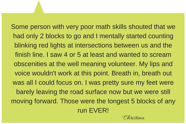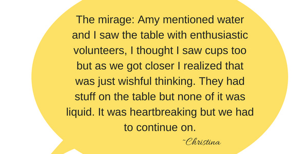 I saw what I thought was one last water stop up ahead and said to Christina, “Do you want to get water here?” I don’tremember her answer, but I imagine it was something like, “YES!” Only the thing was when we arrived we realized it was just a few girls with donuts. While that was super sweet, donuts on a super hot, humid day and no water seemed about as appealing as hot chocolate at that moment!! I was sad that I had gotten Christina’s hopes up. It was time to just soldier on to the end.
