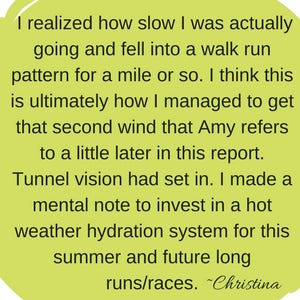 Sometime between that point and the next water stop Christina became comfortable with the fact that I was staying with her. Her breathing settled. I know this because I couldn’t hear hear breathing anymore. She started running more and walking less. I felt optimistic for her. She would finish this race and give it the best she had today.