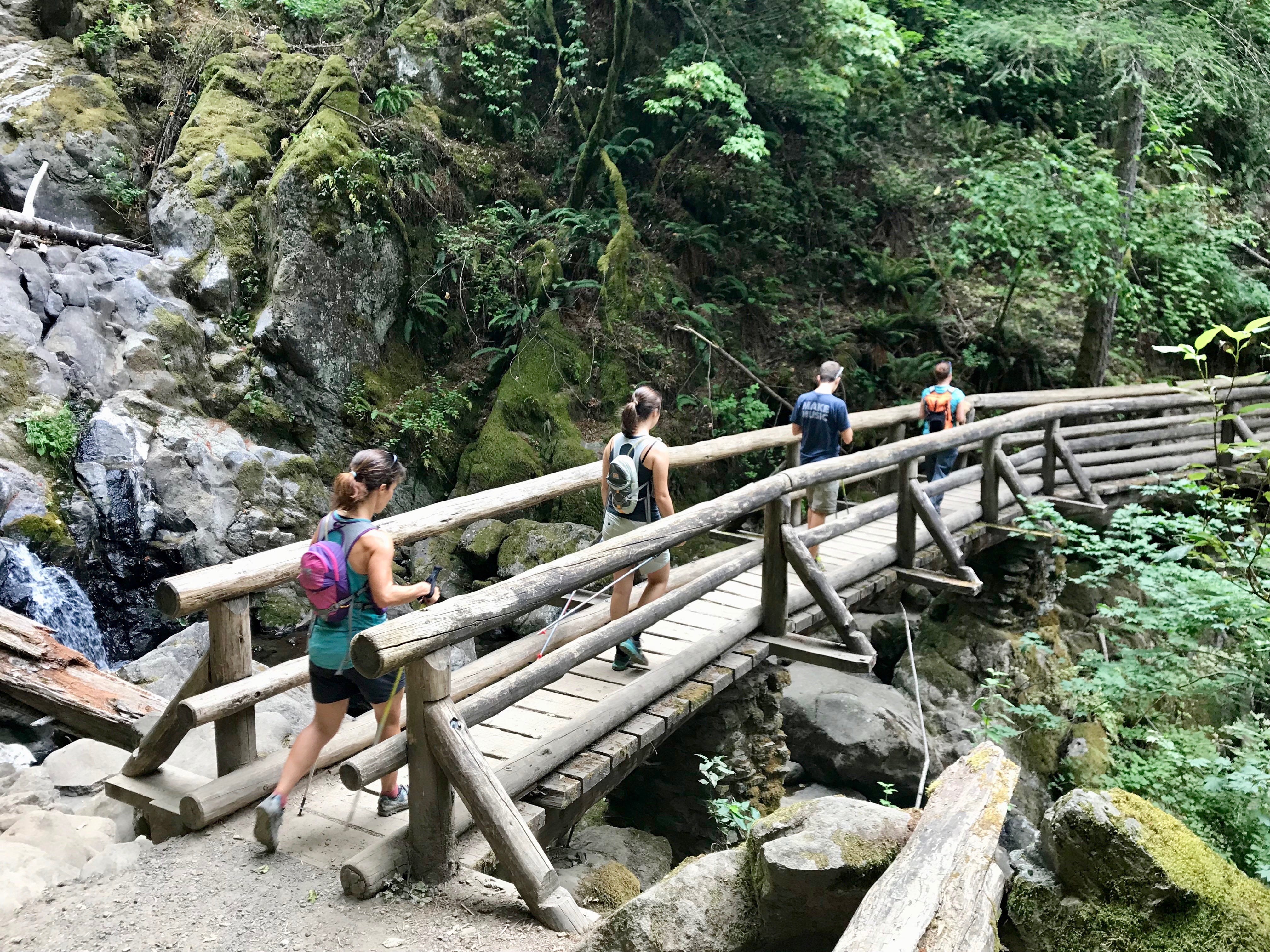 Near the waterfall we crossed a log bridge that reminded me of Thunder Mountain or Splash Mountain in Frontierland in Disney. Both Scott and I remarked about this. It made our Disney lover, Xander, happy to feel like he was enjoying a piece of his Disney world. Sarah carried Quiggs across the bridge because she was worried his little paws could get caught in the gaps between the wooden slats.