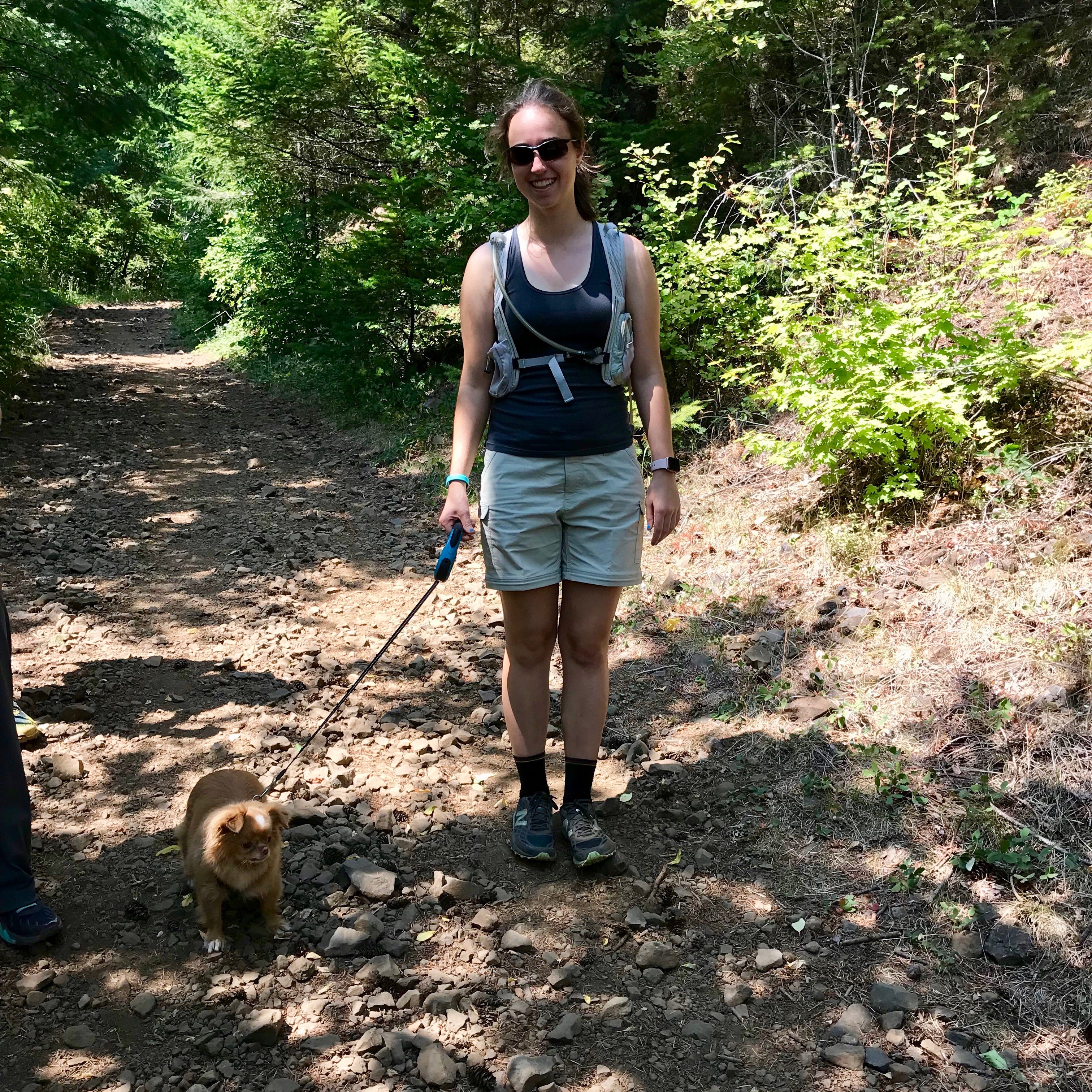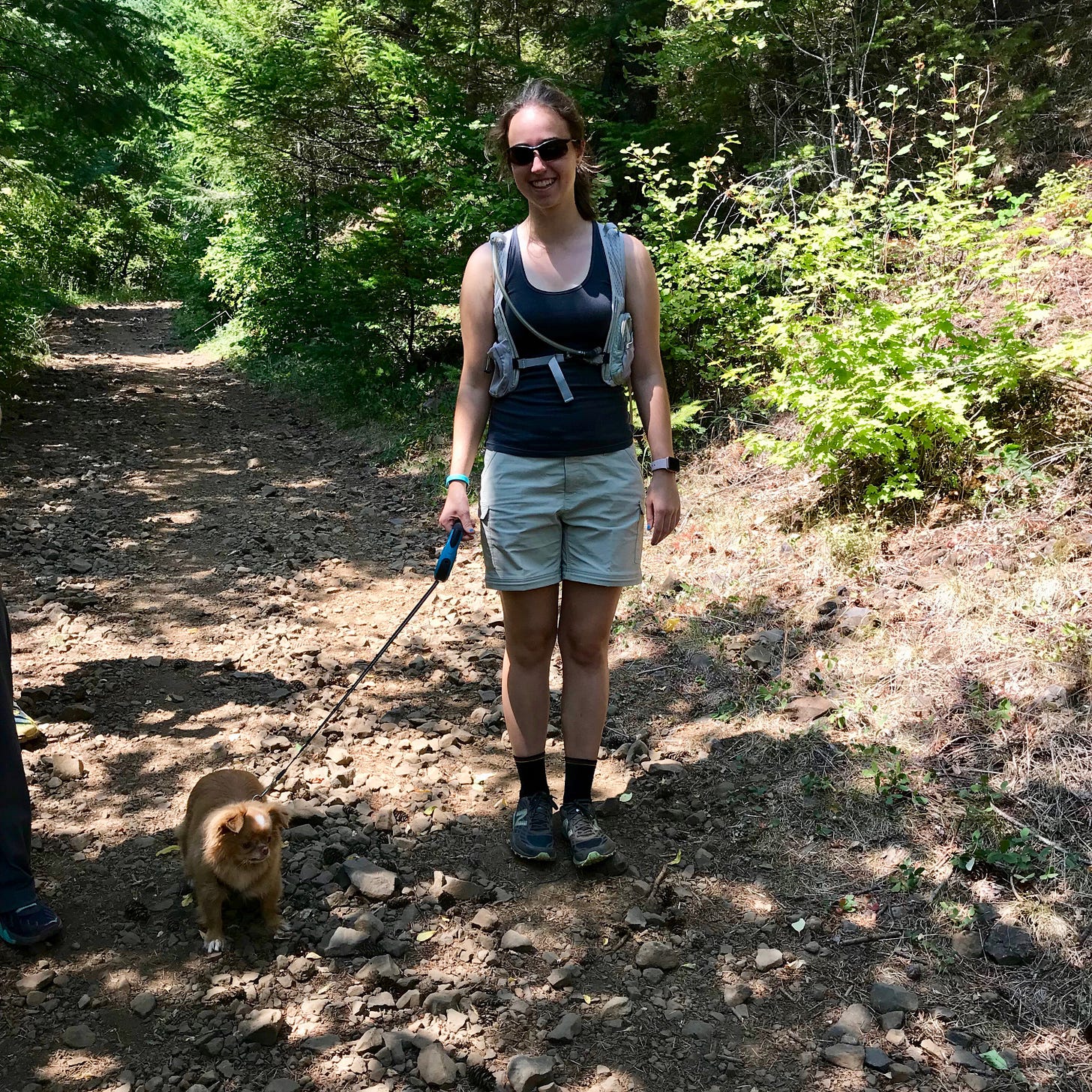 This was my first ever hike with Sarah’s dog, Quiggly. I’d just met him for the first time a few days prior and she suggested that he might enjoy our hike up Hamilton Mountain in Washington. If Quiggly was game, we were happy to have him!! He is a little dog but he is a trooper. Sarah thought he’d manage to hike most of the trip as long as we were ok with his pace. After two days of family hikes, we felt fine about letting this little dog set our pace for us.