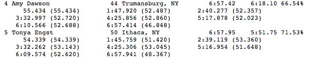 As I rounded the first third of that last lap, Scott shouted “Bear!” and I smiled. Yes, let’s actually try this time and see if I can speed up. I put as much speed on as I felt was reasonably maintainable until the finish and tried to catch Tonya to move into 4th. I overtook her by the tiniest smidge right at the end for a last lap of 46 seconds. Ironically that was my last lap time of the successive 200s in training that I was so bummed about. I suddenly wished I could have pushed a little harder to hit 44 or 45 seconds.