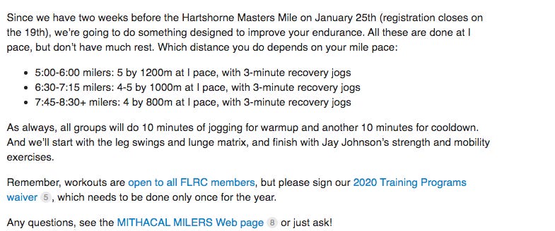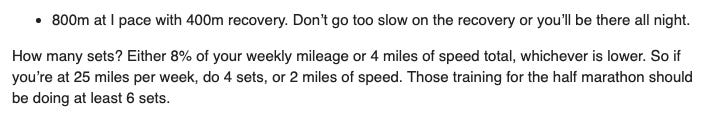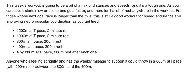 Ever since the one week I was too afraid to look at our workout, I’ve braved opening my email. It really is easier to know what is coming than to be in the dark. This week’s workout sounded tough. It included a 1200 at I pace. However it started at the max distance and went down. I typically do really well with this type of workout.