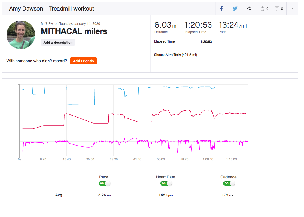Our workout went really well. After another 10 minute official warm-up we started. We were able to hit our goal of 55/56 second splits. The group chatted about dinners and kids and fitness goals during our lovely rest time and we got to know each other better. I left more energized than when I arrived and super pleased that I hit 6 miles with the evening (that’s what I put into the marathon training plan for Mithacal Milers nights).