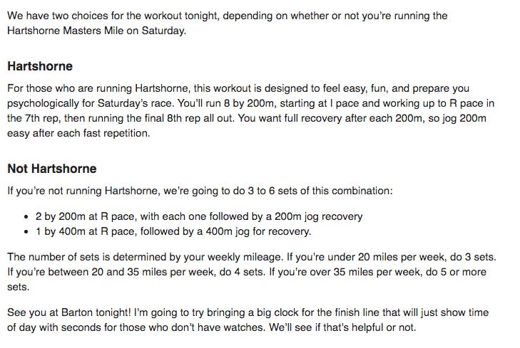 Early in the day Adam sent his weekly workout information to us. Scott and I aren’t doing the Hartshorne Masters’ Mile this year so our plan called for a 200 - 200 - 400 ladder at R pace. This didn’t sound too bad, so even though I was afraid I knew it would be a fine evening.