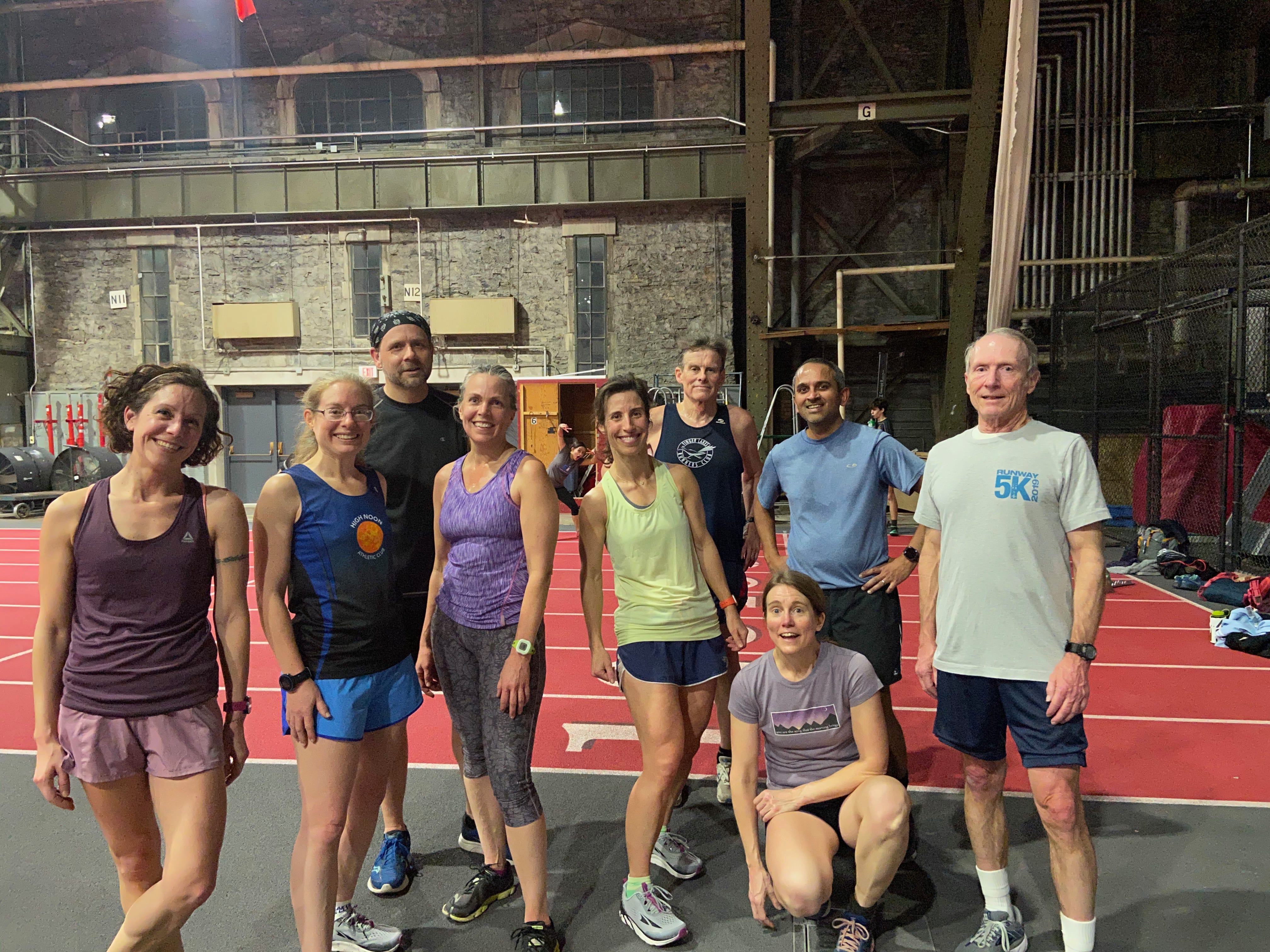 As you spend week after week running with a crew of people you start to depend on them. You look forward to the casual conversations and connections you make every Tuesday night. It becomes something to brighten up cold winter evenings. Tonight I really wasn’t jazzed about running. It would have taken almost nothing to talk me out of going, but as with every week I was completely energized when I arrived. My group is fun and committed and I enjoy running with them. As we started our first 200 of the last set one of our group members who isn’t doing too many weekly miles said he was going to peel off. We convinced him to do one 200 with us. I seized the moment and asked if we could stop for a quick photo after 3/4 of our cool down loop. I explained that I blog about this group and it would be fun. Everyone was up for it so we got our photo. After the photo we started right into our 2nd 200. I looked to my left and he was still running with us. I smiled and said, “you are still here!” He replied, “you guys are making it too hard to leave.” That is the power that is in the group. We all bring each other up and we accomplish more than we would if we were completing intervals on our own.