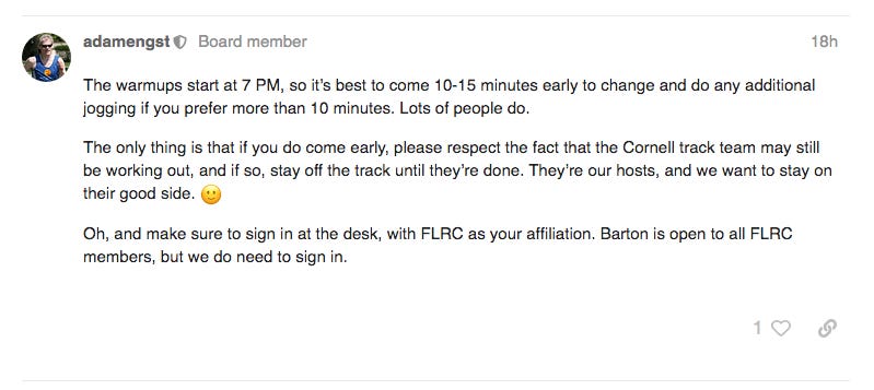 It wasn’t supposed to be the last week, but Coronavirus has really impacted the area. Cornell is taking measures and stopping large gatherings, and Adam decided it would be our last indoor week. When we arrived at Barton we waited for awhile and talked about how the FLRC just had to make the decision to cancel the Skunk Cabbage Classic for this year. The Cornell indoor track team wasn’t wrapped up by 7 like they normally are - in fact they were setting up hurdles at 7 pm. Soon, Adam called us over to the middle and we decided to start our warm-up on the infield followed by an outdoor warm-up.