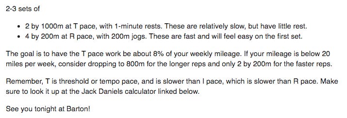 Last week was my friend Laurel’s first time going. It turned out to be the first week we missed. She mentioned she was in Tonya’s group so I knew that meant that Tonya’s foot recovered and she was back. When I walked into Barton, Laurel was one of the first people I saw. We chatted about the distances and I shared the email story with her. She said, “I think it is 1000 repeats followed by 400s.” Hmmm. 1000 is better than 1200s. 400s are not better than 200s though. We chatted along and pretty soon it was time to warm-up. Whatever the workout, the time had come to just do it.