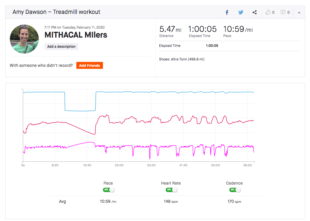 I had a really busy day at work and then went home and baked for Emoticakes, made a couple of parent phone calls for teaching and headed straight out. I hadn’t really processed the workout until I got there so I didn’t have time to be anxious or stressed about this. After 1000s last week these felt so nice! I settled into my spot right behind Caroline and just enjoyed the loops. Since I still haven’t sorted out my watch situation I was extra grateful that both Caroline and Tonya were there. They both like pacing us and are very good at it!