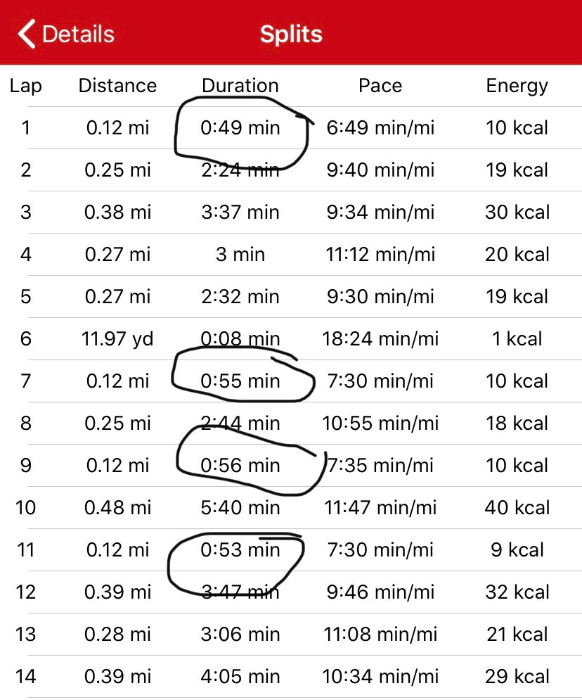I got the paces for the total distance each time and wrote them on my hand and then borrowed a watch from Xander to wear on my right arm. The Apple watch doesn’t work well for intervals. It was weird to wear a watch on my right hand, and I couldn’t figure out the split function on it, so I had trouble with pacing on the multi-lap ladders.