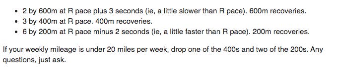 After our 10 minutes of jogging and 10 minutes of dynamic stretching we gathered for the start. Adam verbally shared the workout. Two 1000s at T pace followed by 4x200s at R pace. Laurel and I exchanged a smile. Both she and Scott had gotten half of the workout right! Soon we gathered with the 7 minute mile crew and within minutes we were off on our first 1000. There wasn’t much time to think.