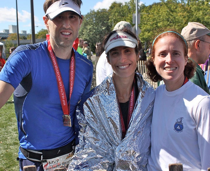 My FIRST marathon!! I used Hal Higdon’s Novice 2 training plan, while falling back to Novice 1 for a lot of the weeks. I reasoned that I had used his Novice 1 Half Marathon plan for my first half, and was now a stronger runner. Scott and I had joined Daily Mile in the late summer of 2011, and in doing so our training bumped up from sporadic to extremely consistent. Shortly after joining, I met to my my soon to be running partner and good friend at the Red Baron Half Marathon in 2011. Jenny and I were friends on Daily Mile for a few months when our mutual friend learned we were both training for a first marathon. Jenny was Chicago bound and I was heading to Rochester just a few weeks earlier. The timing worked, and we started our training together. We had only met in person once, very briefly 5 months earlier so I we were both a little apprehensive about running together. Our first training run was LONG on a very hot day! About a mile into our this run, we started discussing our mutual dislike of babies. We still laugh about that moment. We knew we were going to be great running partners, and we’ve become close friends as well.