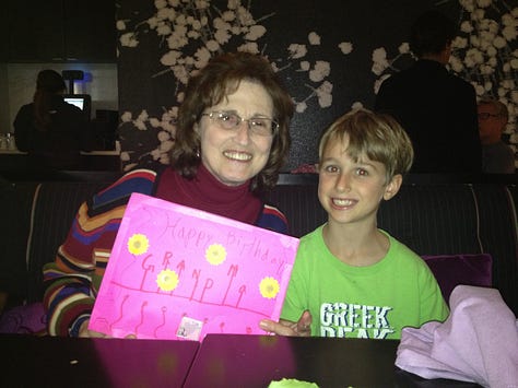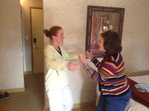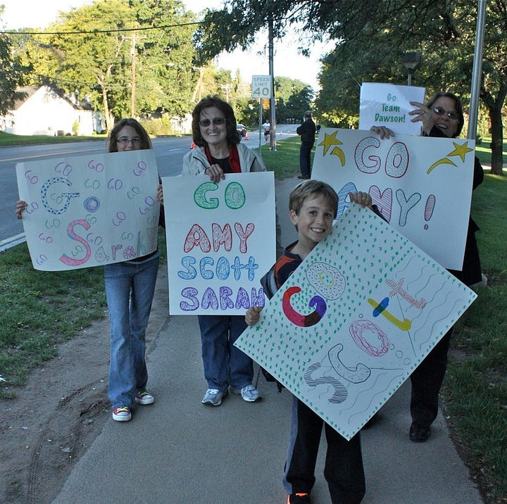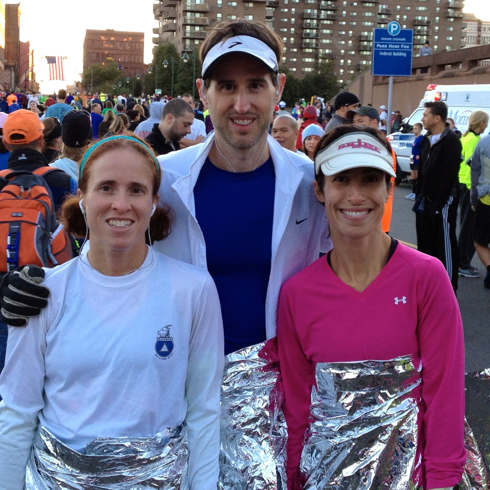 For our first marathon, we had an entourage of people coming up to support us. Scott was suffering with an IT band injury and hadn’t run farther than 14 miles in training, but he was determined to finish! It was my mom’s 70th birthday, and my sister was flying in from Portland, Oregon to join us in the race and to surprise my mother. Our parents were coming up with us, and of course the kids were joining them in cheering for the 3 of us. Sarah surprised my mother in the hotel room the afternoon before, and we had celebratory cupcakes as part of our pre-race spaghetti dinner.