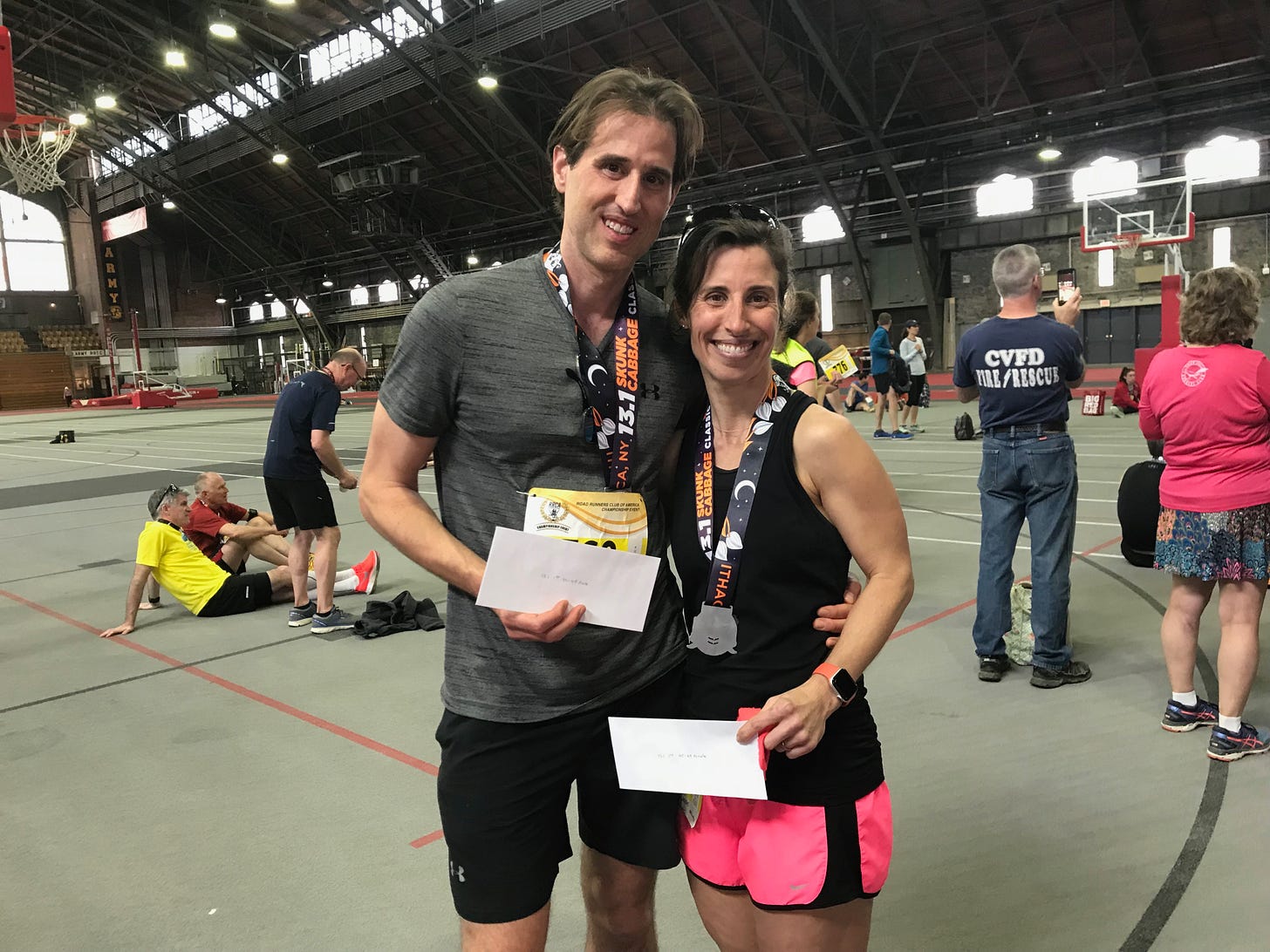 After the Master’s winner was stripped off, Scott came in first in his age group so we were waiting around for awards. I ran into my co-teacher, Rocco at the race. His girlfriend had run and he enjoyed spectating. He congratulated me on a nice run and then I headed over to get some yogurt. My friend Laurel walked over as I was starting to peer at results and said, “Congrats you both got 2nd in your age group.” I thought, Huh? why would that be? Last year I ran a good race and didn’t get anything and this year I run much more slowly and get an award. Laurel ran SO much faster than I did and didn’t win an age group award. I found that laughable and remembered that racing really is all about who shows up. Turns out that after Master’s winner was stripped off both Scott and I left with first place. Pretty fun! Read all about Scott’s race.