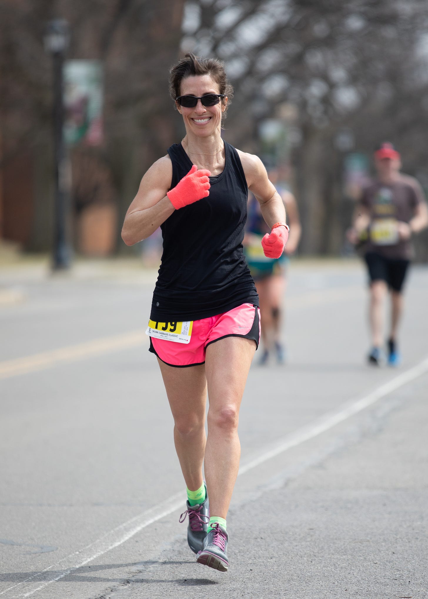 We woke to sun and a forecast calling for temps in the 50s on race day. I have learned from experience that this means shorts and a tank top. I decided on disposable gloves too, just in case. I gave little thought to my clothing choices though, selecting a new Athleta tank that Elizabeth had bought me for Christmas. Halfway to the race I realized I didn’t want to pin into it. I decided my shorts would be a fine surface for pinning.