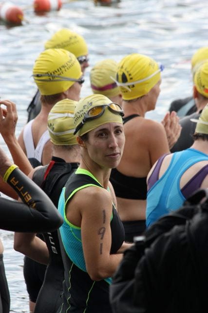 As the woman in the lane neared me I leaned down to ask if she’d mind sharing a lane. She looked up at me and said “Amy, right?” and proceeded to introduce herself, “I’m Emily. I know you on Facebook from Team FLRTC.” Oh, yes! “Petrina, right?” and we laughed that we knew each other virtually, having never met in person. I said “I can’t swim”, and she said “That’s ok, I’ll stay on my side.” I hopped in.